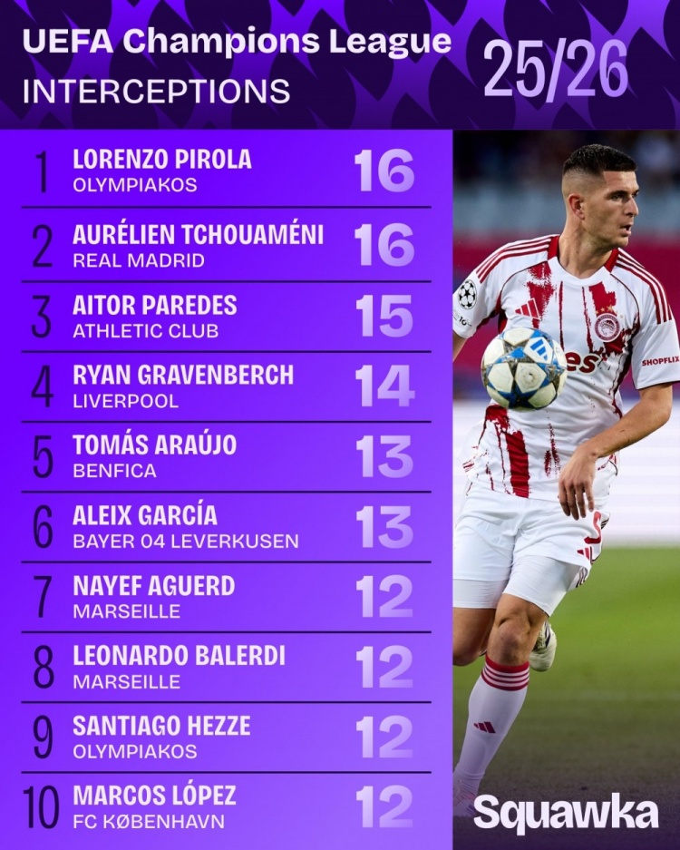 1月23日讯 Squawka统计了球员本赛季欧冠的拦截次数,并列出榜单,琼阿梅尼、皮罗拉16次居首。